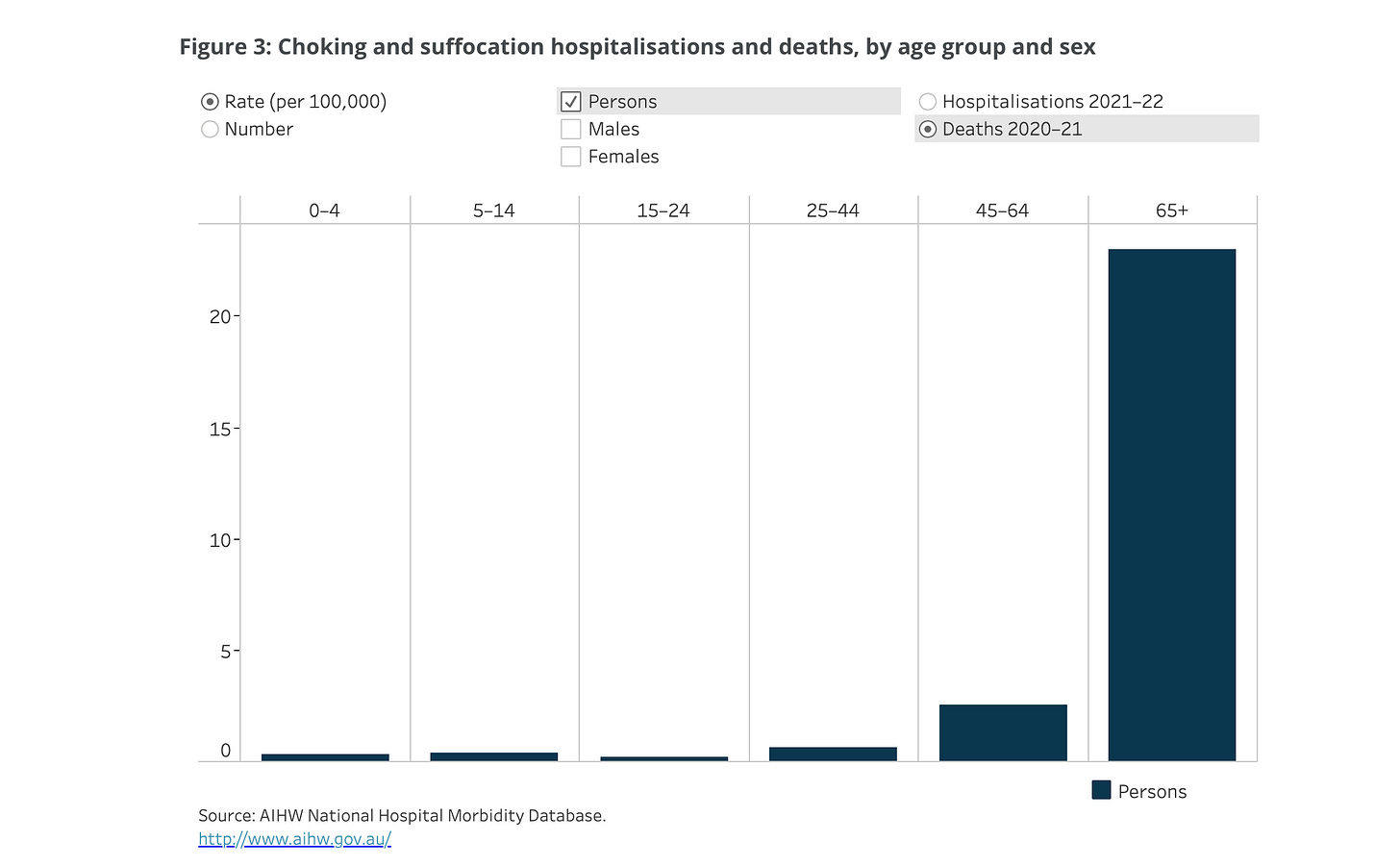 According to Australian statistics 1200 people died as a result of choking during 2020-2021. This represents 9% of injury deaths (4.6 per 100 000). In the USA 5,554 people died due to choking in 2022.